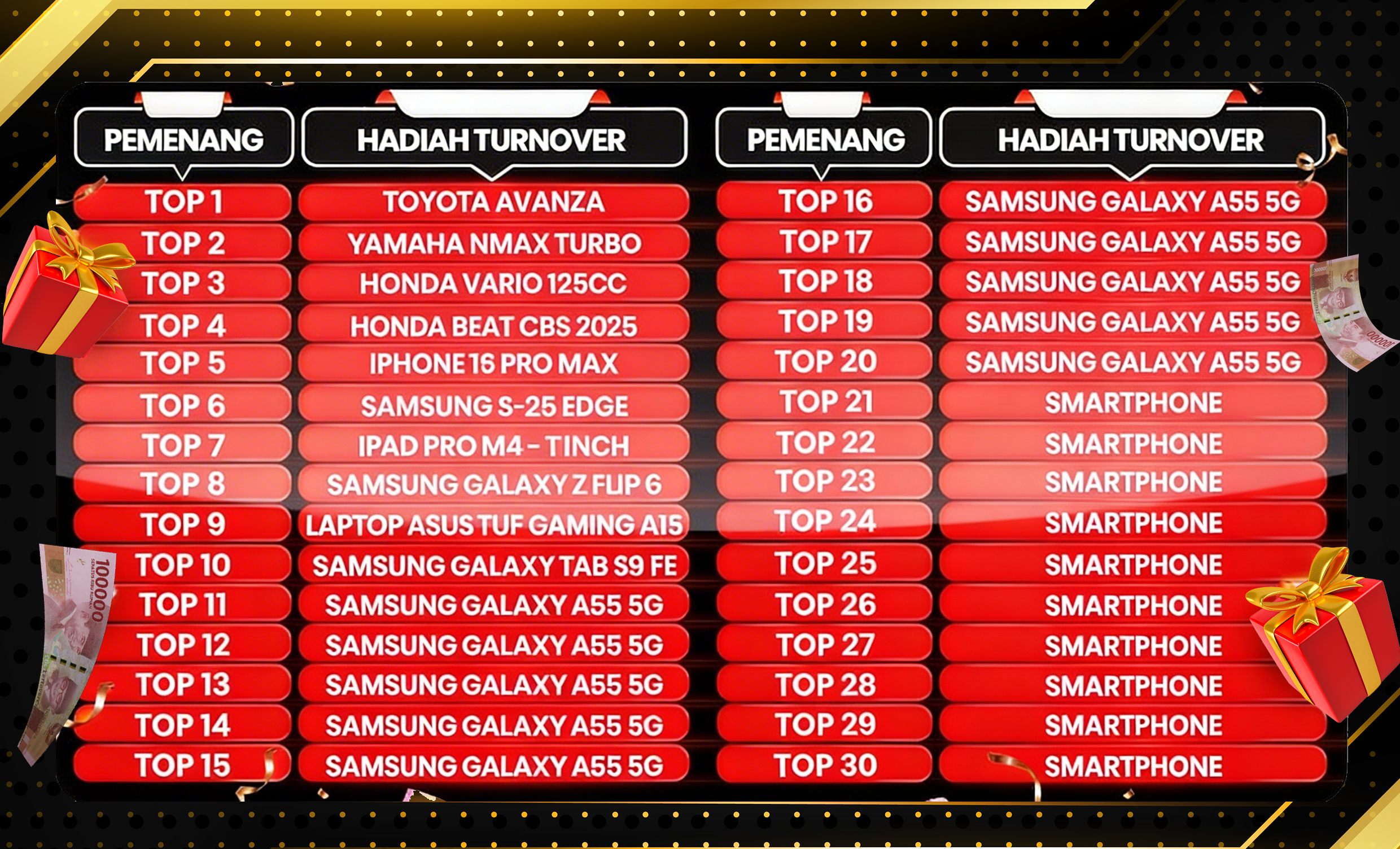 BERIKUT LIST HADIAH EVENT PANJAT TURNOVER CASINO, PRAGMATIC CASINO & SLOT :